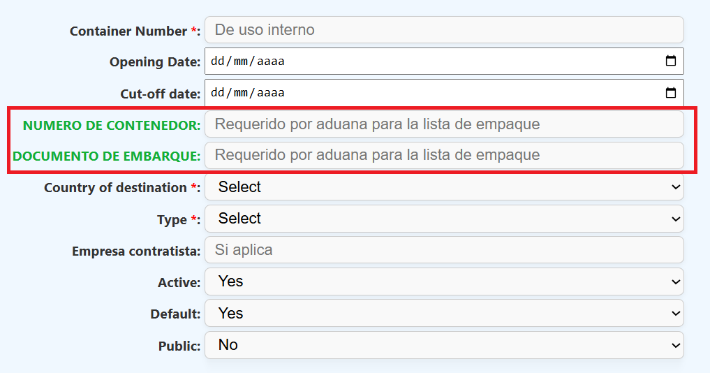 Asegúrese de completar los campos NUMERO DE CONTENEDOR y DOCUMENTO DE EMBARQUE que son los que aparecen marcados en rojo en la siguiente imagen: